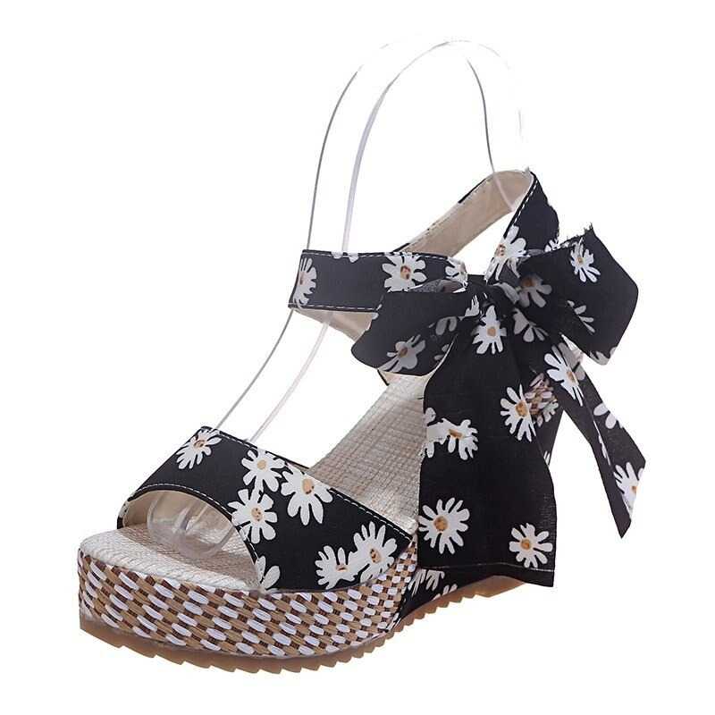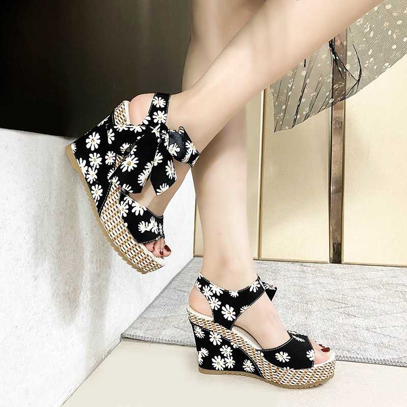 Sandały koturny w kwiatki Black