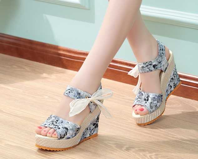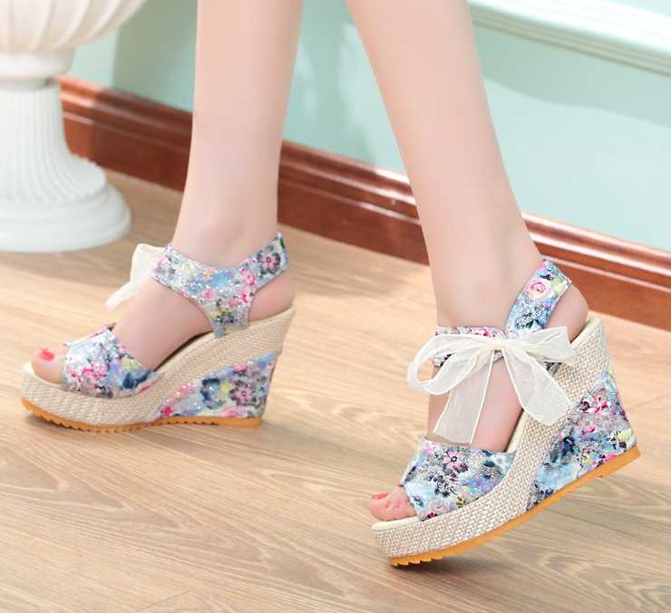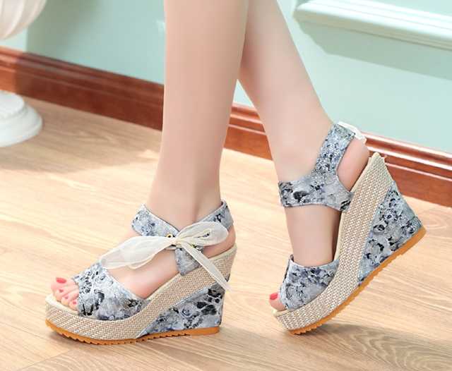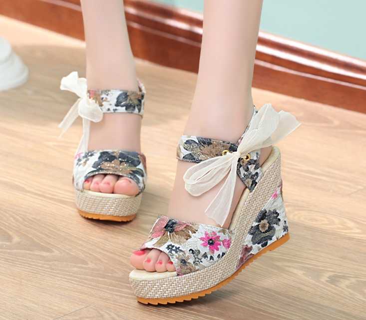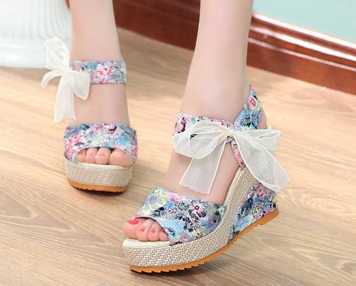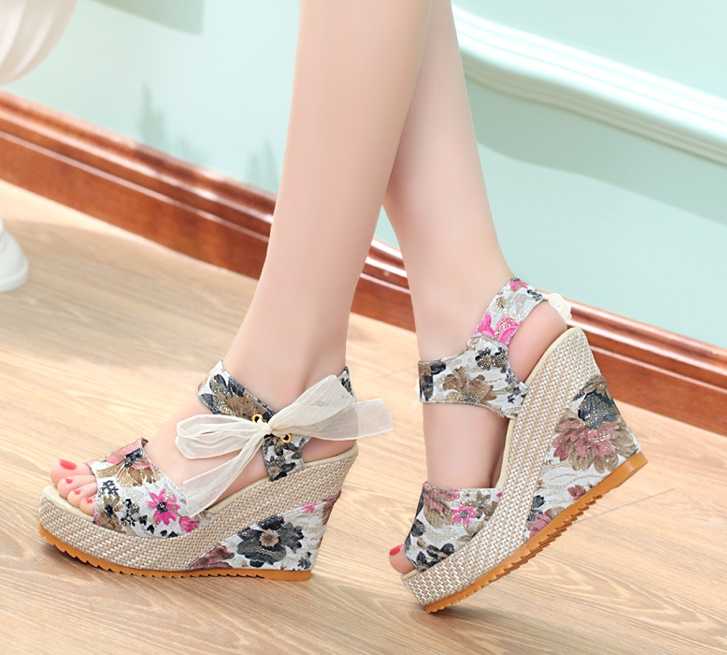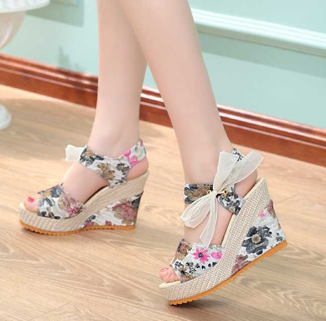 Klapki na koturnie w kwiaty