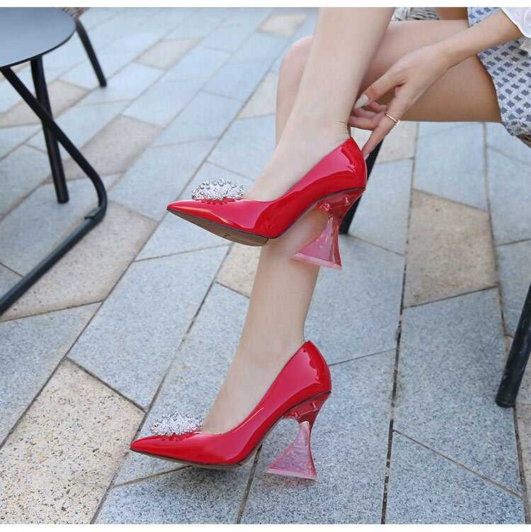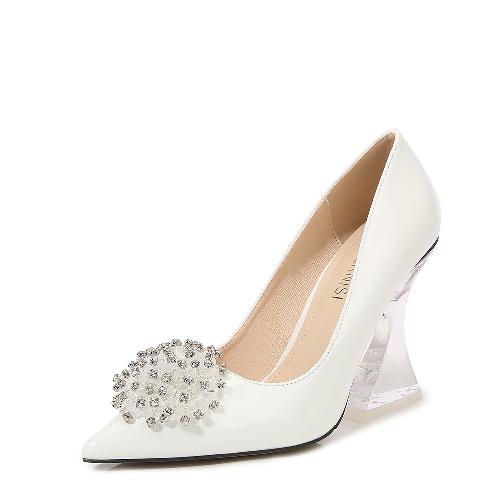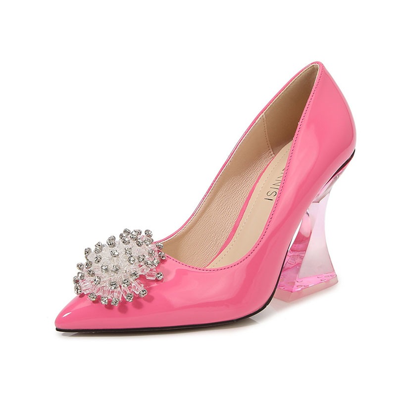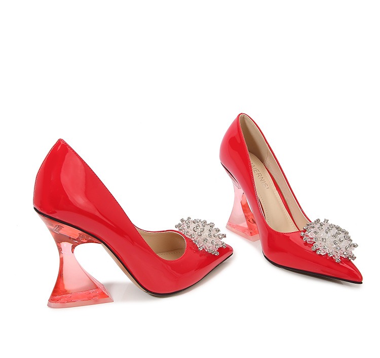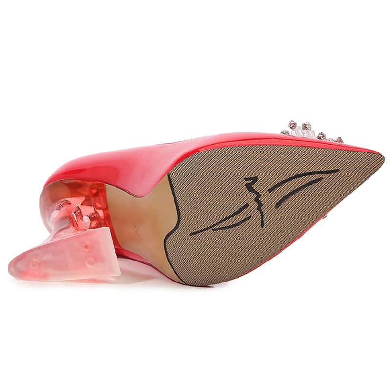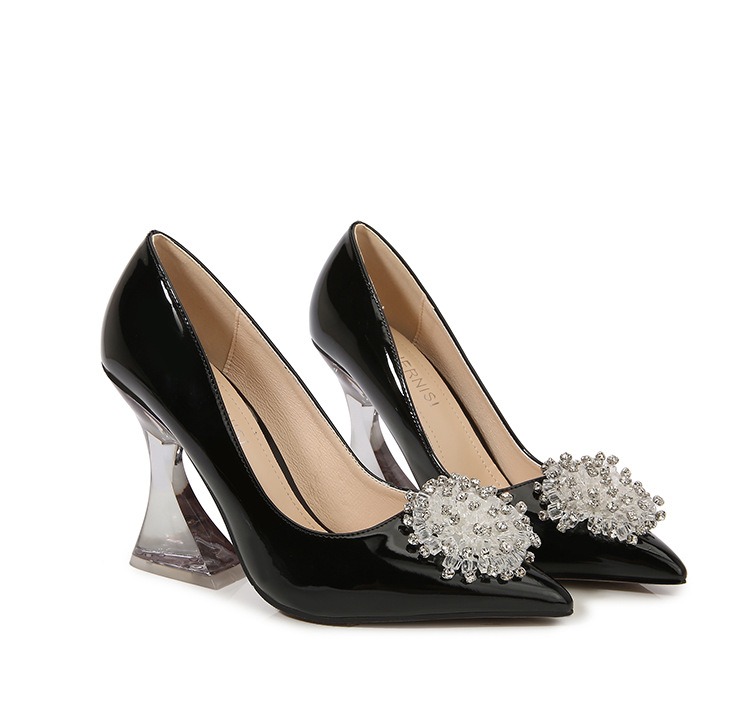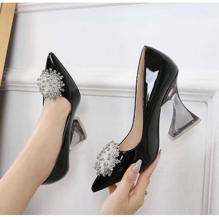 Buty są wykonane z trwałych materiałów. Mają przezroczysty rozszerzany obcas, który dodaje butom subtelnej finezji. Nosek buta jest szpiczasty, co wprowadza nutkę klasycznej elegancji. Ozdobna kryształowa broszka na przodzie buta, dodaje eleganckiego i zmysłowego wyglądu, idealnego na specjalne okazje.